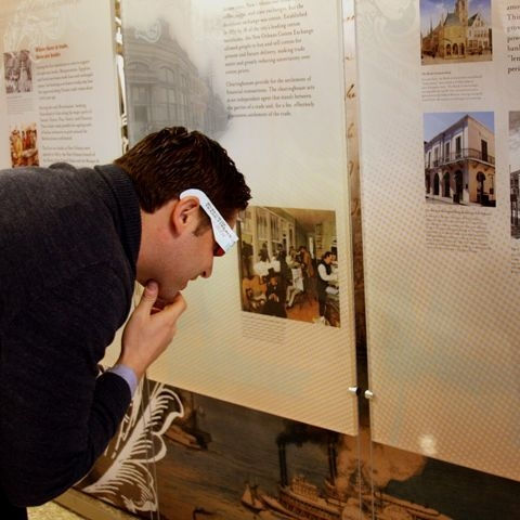 As visitors enter the lobby of The Federal Reserve Bank of New Orleans, they are welcomed by elegantly swirling early banknotes. These floating notes naturally guide visitors from one media interactive to another. “Design Your Own Banknote” and “Test Your Knowledge” quiz games are a couple of the computer interactives that encourage visitors to engage with the story of the financial history of Louisiana and show how monetary policies work.